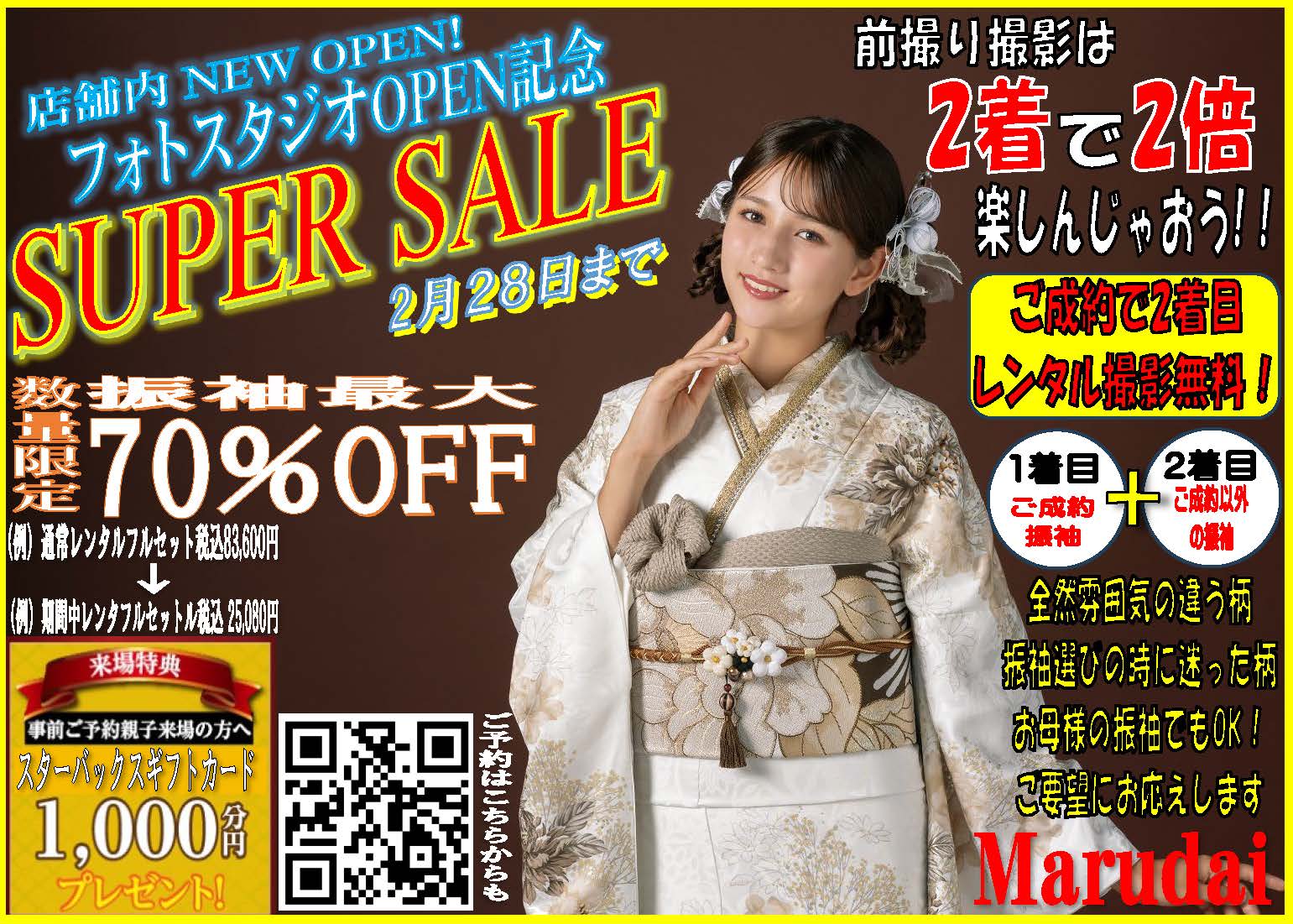 店舗内NEW OPEN! フォトスタジオOPEN記念 SUPER SALE2月28日迄開催中 新作も入荷しました!芸能人の着用柄や人気の柄は早いもの勝ちになります! お仕度時間も優先確保(^^)/ 来年に成人式を迎えるお嬢様は...